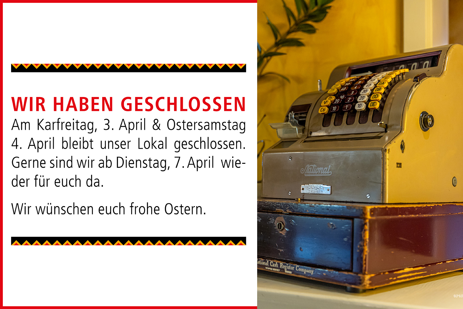 Am Karfreitag, 3. April & Ostersamstag 4. April bleibt unser Lokal geschlossen. Gerne sind wir ab Dienstag, 7. April wieder für euch da. Wir wünschen euch frohe Ostern.